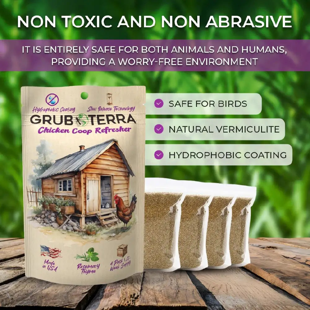 Hydrophobic vermiculite stays dry, prevents clumping, & slowly releases essential oils. Keeps bedding fresher longer while extending the life of chicken coop bedding.