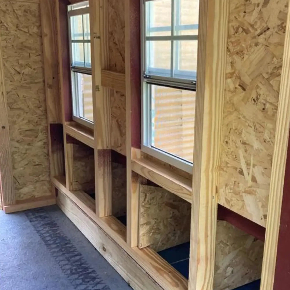 • All panels and trim are painted and assembled, all hardware is installed, doors & windows are installed, nesting boxes are assembled, and metal is installed on the roof panel.