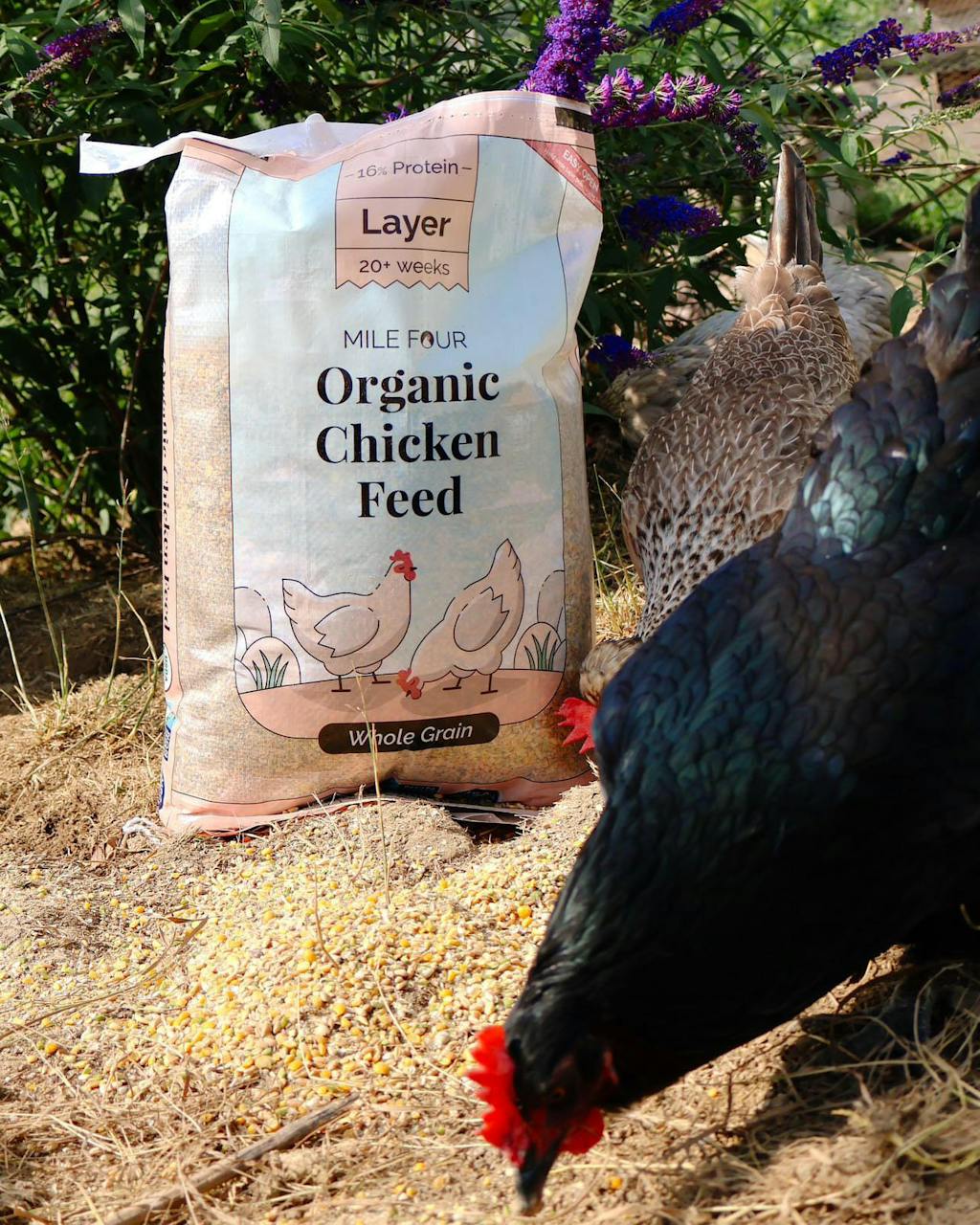 Whole Grain: Cracked grains & unprocessed ingredients in their natural state resulting in a granola-like texture large enough for chickens to grab.